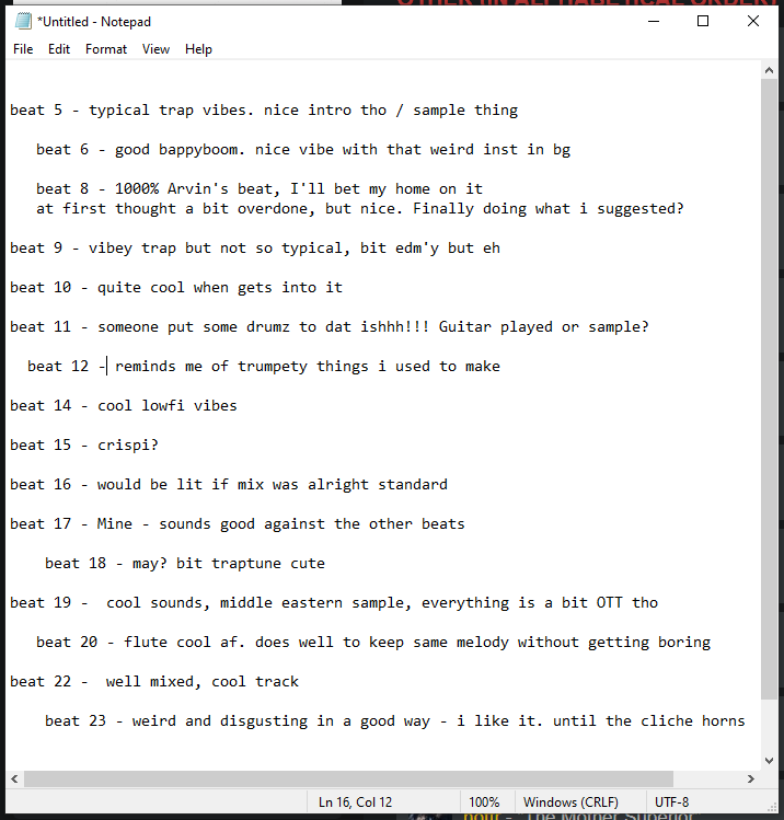 Note: any beat 'nudged forward' in the notepad means it was in my kinda 'finals' round.